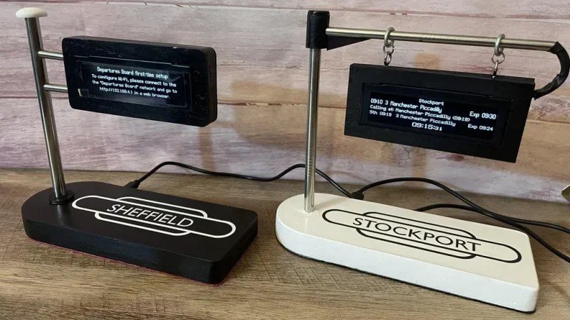 [eastfamilyreddish] took the concept further by adapting this hardware into a more pleasing form. The ESP32 and OLED screen are built into a neat little hanging sign setup that apes one you might expect to see at a real railway station. You might expect that 3D printing was involved, but instead, this was achieved with lasercut parts and resin casting to create something with a beautiful finish. They even went so far as to include a wireless phone charging module in the base, making the device extra useful to really earn its place on the desktop.