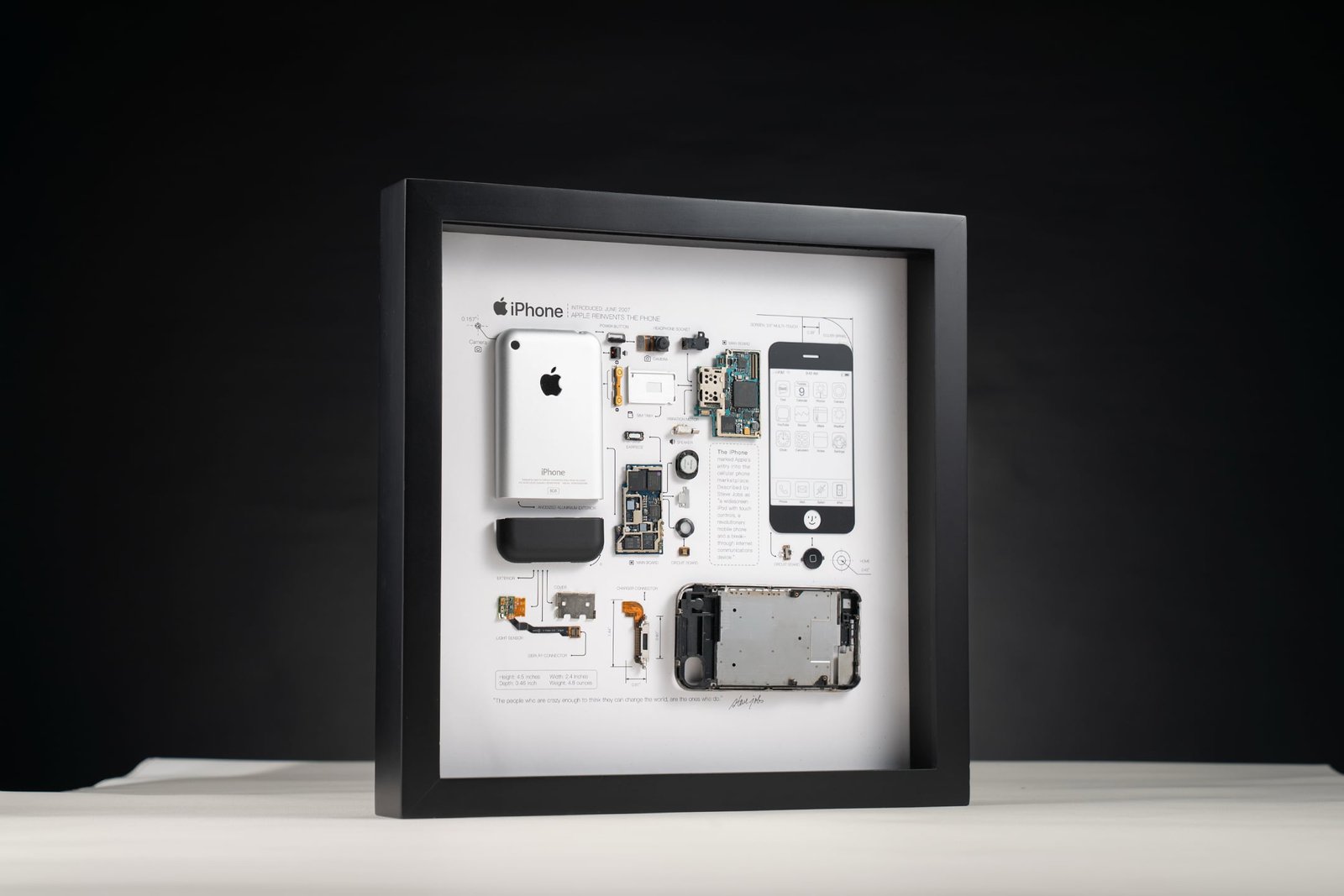 Each GRID frame features a deconstructed Apple device with all of the components carefully laid out and labeled. There are also useful facts and relevant details about each product, along with a Steve Jobs quote. Most frames are around 11 inches by 16 inches, with some smaller square versions also available.