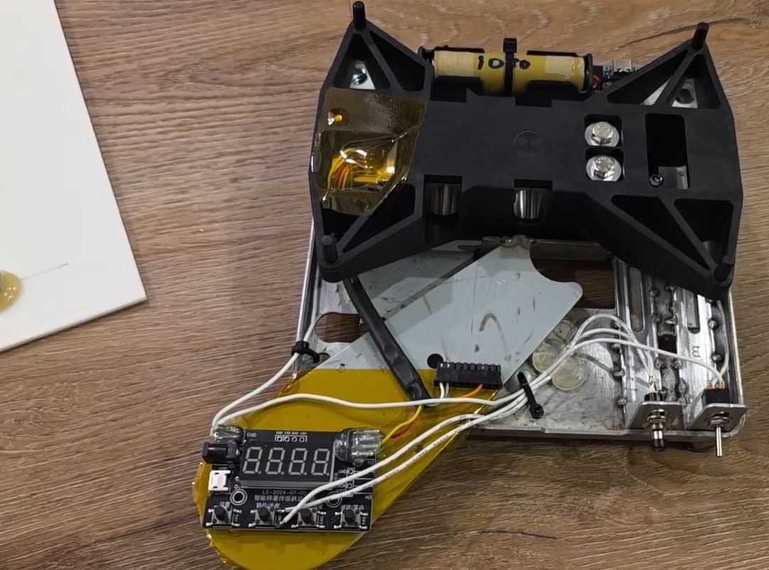 The only purpose-bought part was an HX710-based strain gauge amplifier module for $7 with LED display, with the metal base getting some metal bits welded onto it to hold said module as well as a push button and toggle switch. Existing wiring from the load cell was wired into the HX710 module, with power provided from a single 18650 Li-ion cell. This was paired with the standard TP4056-based module and its protection IC.