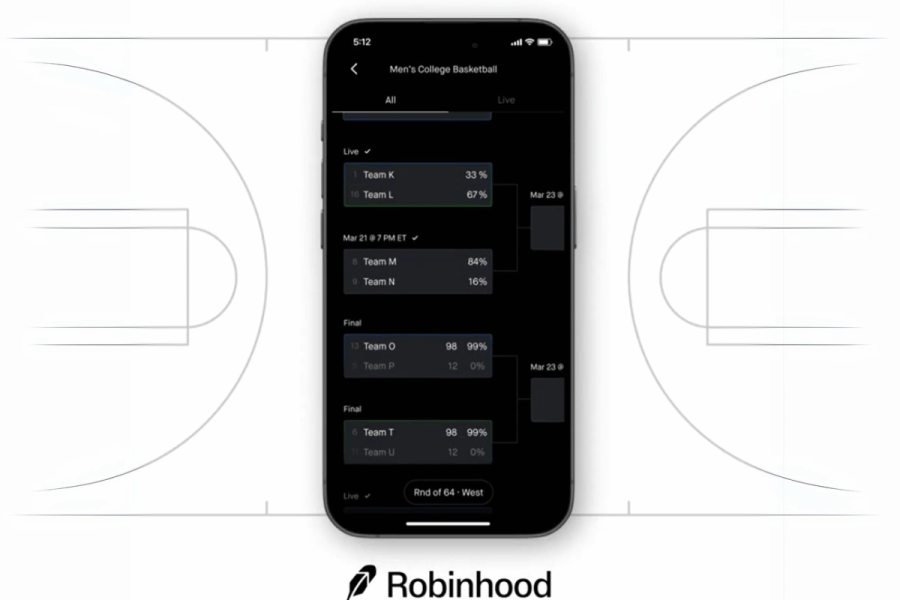 Massachusetts investigated Robinhood over launch of prediction markets hub. They're now filing a brief against them. A smartphone displays the Robinhood app’s prediction markets hub for Men’s College Basketball, showing matchups, dates, and percentage odds for each team. The background features a faint outline of a basketball court, and the Robinhood logo is visible at the bottom.