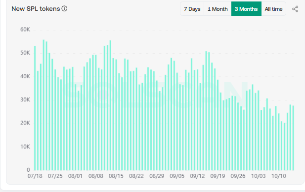 According to Solscan data, the number of newly minted SPL tokens, which includes meme coins, dropped by about 50% from early August to mid-October, falling from about 60,000 per day to as low as 30,000.