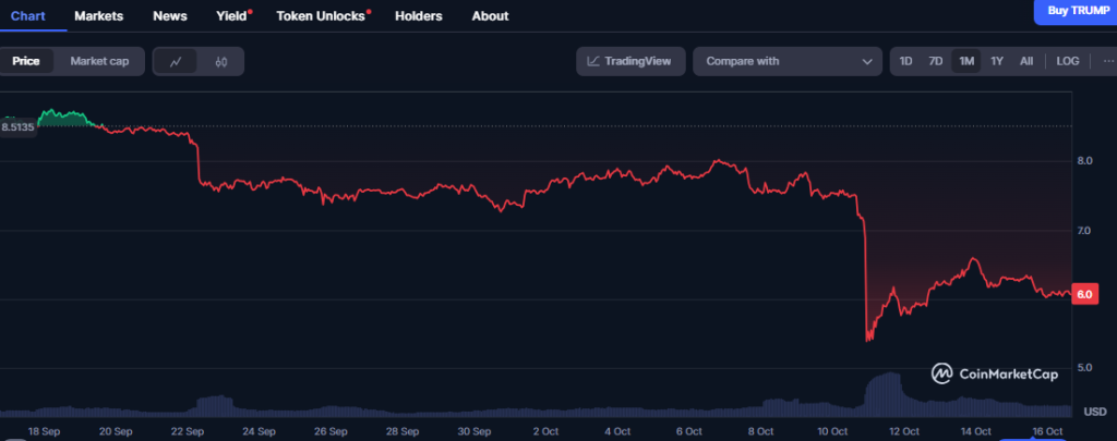 Additionally, even politically themed tokens were not spared, as the official meme coin linked to U.S. President Donald Trump dropped 20% over the week, extending losses across a market already struggling to stabilize.