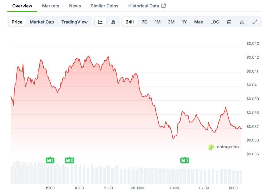 The price drop came just three days after Monad’s mainnet debut on November 25. Despite the decline, MON remains up 47% from its opening price of around $0.02.