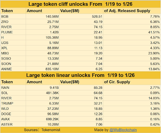Between January 19 and January 26, the crypto market is bracing for major crypto token unlocks. These include both one-time cliff unlocks and scheduled linear unlocks. According to Tokenomist data, combined, the value of these crypto token unlocks exceeds $1.054 billion.