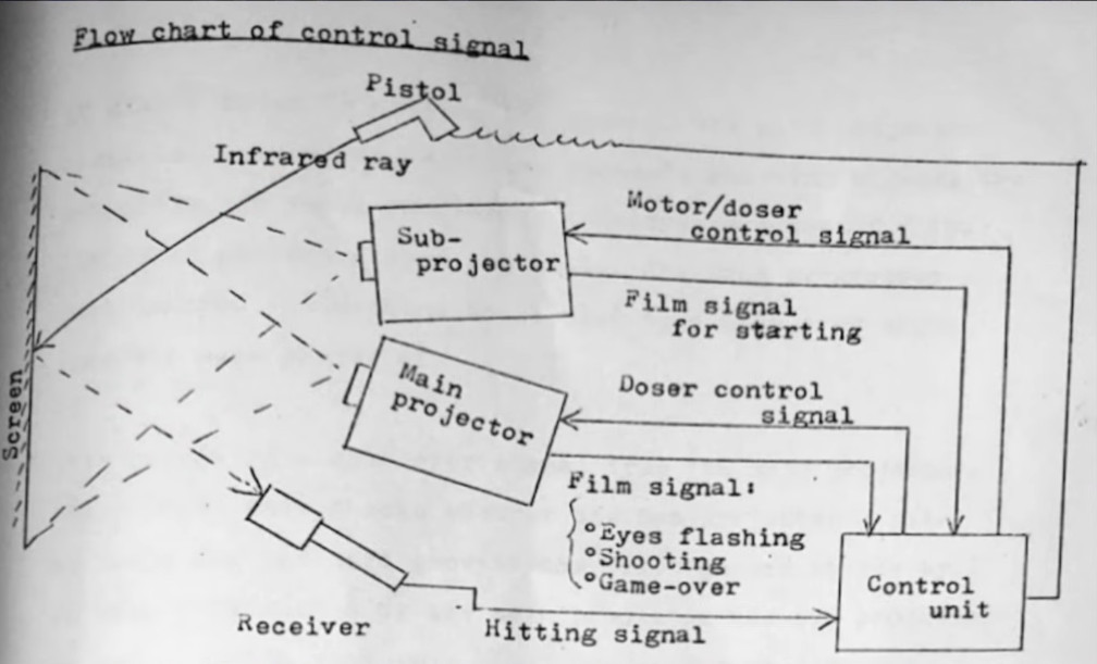 One projector did most of the work, showing the gunmen and a hidden timing signal for the game to know when the user could shoot; the other only activated if the user pulled the trigger at the correct time. Interestingly the ‘gun’ has an IR illuminator that bounced infrared light off the screen to a detector in the cabinet — much like later TV remotes. That makes for a rather large circular hitbox around the enemy gunslinger, which is perhaps not a bad thing for a game likely to be found in a bar.