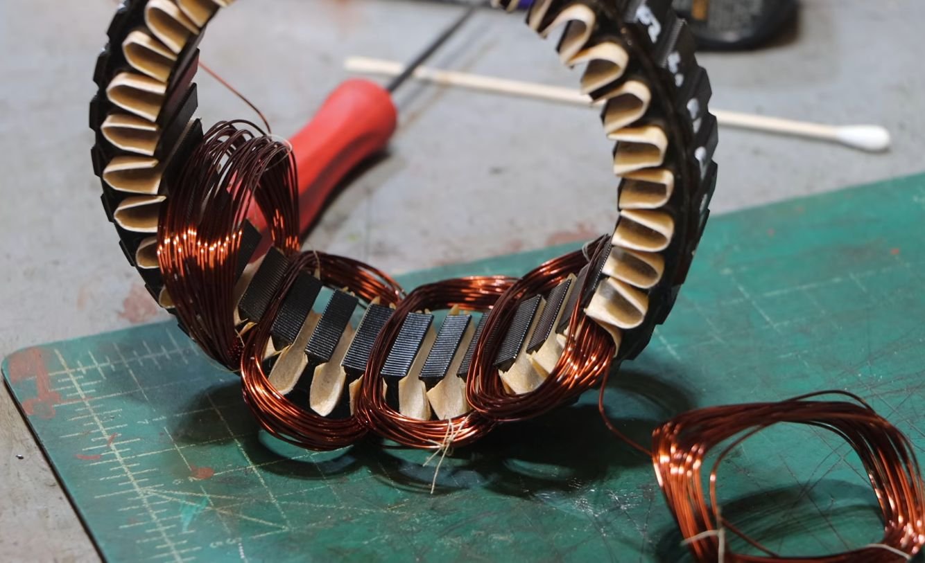 To make sure the windings do not short out on the stator, each slot has a bit of Nomex insulating paper placed into it, and a PETG 3D printed slot holder makes sure that none of the windings sneak out of their slot after installation.