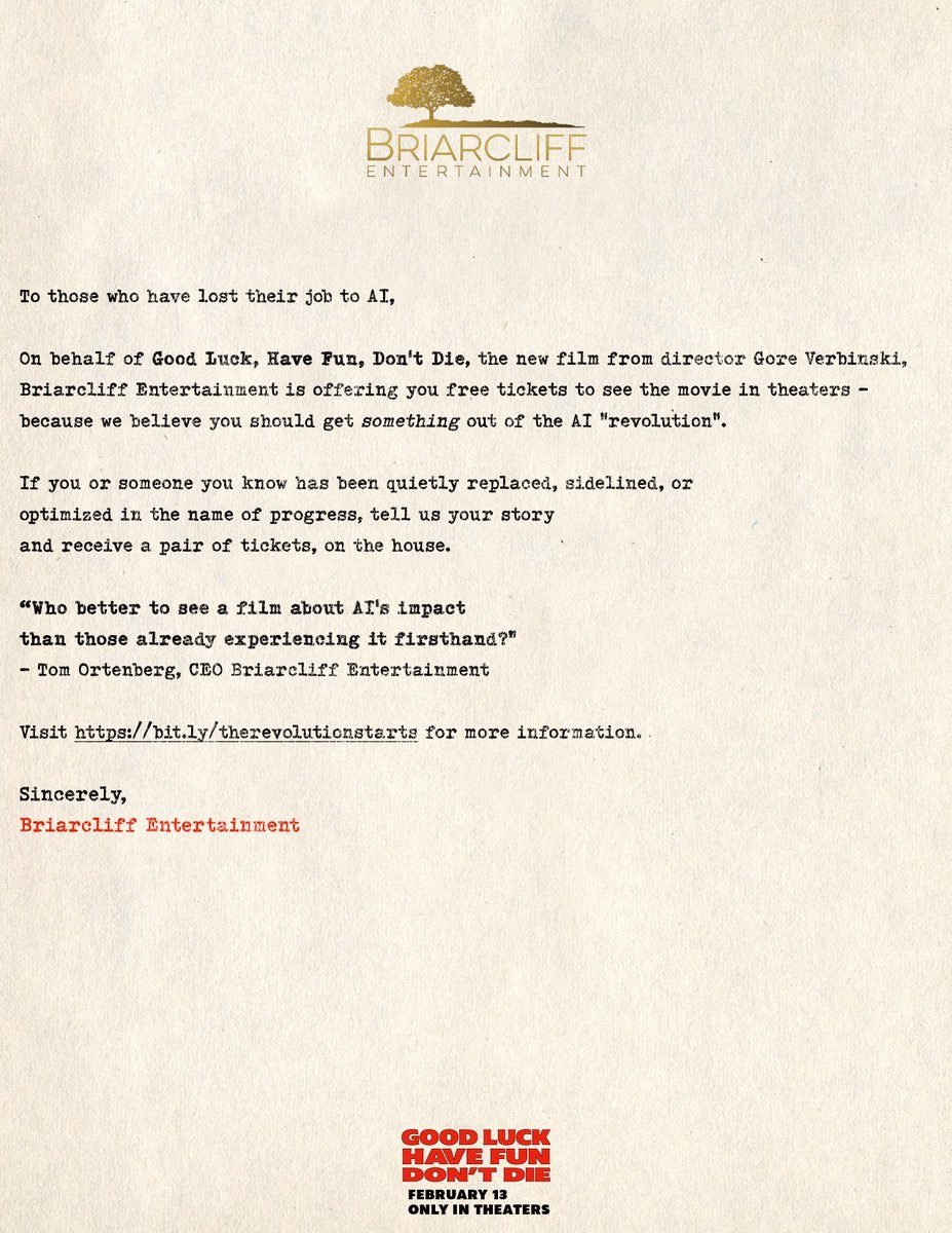 There will be 2000 tickets given out in total to see the sci-fi action comedy. Briarcliff posted a letter on its social pages about the initiative, complete with a brief quote by the company’s CEO. “Who better to see a film about AI’s impact than those already experiencing it firsthand?” commented Tom Ortenberg.
