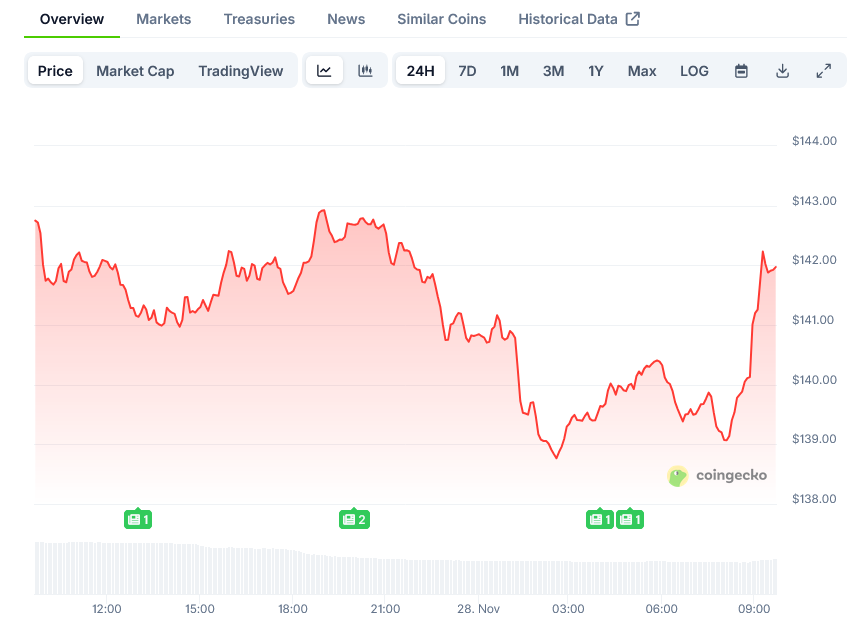 Solana is trading at around $141, up approximately 3.6% over 24 hours. The token remains down roughly 30% over the past 30 days and more than 50% below its all-time high of $293.31.