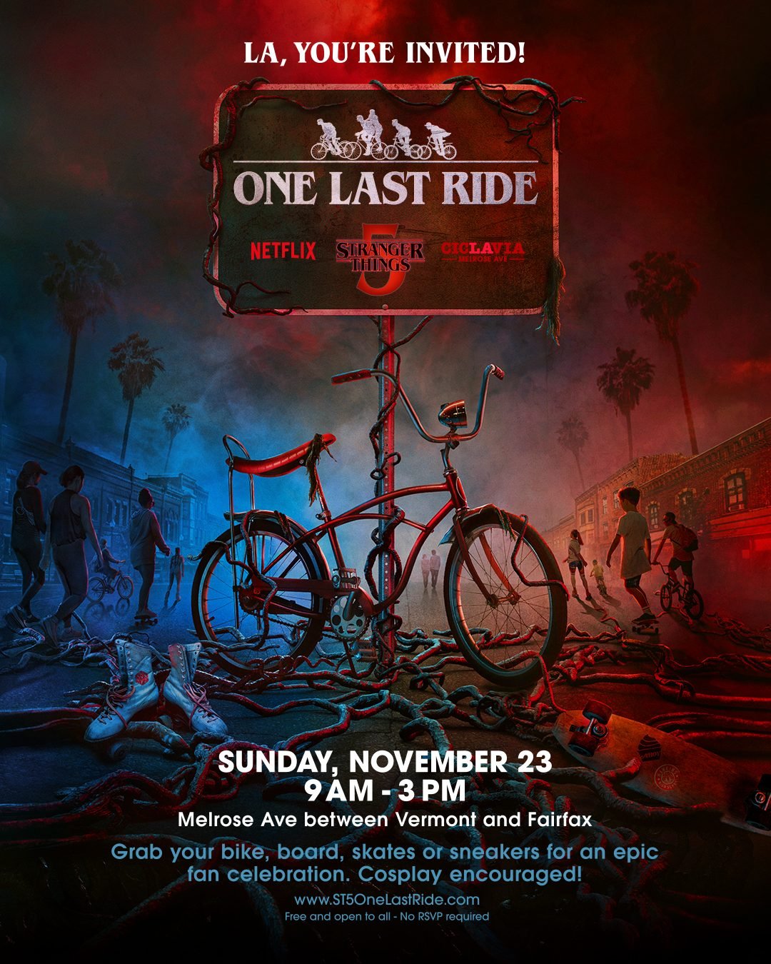Stranger Things 5 is coming our way soon. And though it might not be all fun and games (we actually expect a ton of heartbreak and tears, but in the best way), it’s certainly worth celebrating. And if you’ve been dreaming of stepping into the world of Stranger Things (plus neon, leg warmers, swag, and photo ops; minus Vecna (at least one who can hurt you), Upside Down particles, and tentacle goop), then we have just the event for you. If you’re in LA on November 23, you’re invited to join Netflix and CicLAvia for Netflix x CicLAvia—Melrose Ave: Stranger Things 5 One Last Ride—“an epic event bringing fans together to bike, skate, or stroll along a car-free stretch of Melrose Avenue in celebration of the cultural phenomenon’s fifth and final season.”