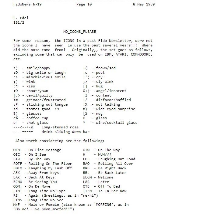 Meanwhile, we can find the first documented use of LOL in FidoNews, a newsletter still in print today. A May 1989 edition features pre-emoji icons to convey a wide range of emotions along with several initialisms like LOL. Other familiar phrases like BRB and BTW appear as well. LOL became commonplace on Usenet, a discussion network that laid the foundation for Internet forums with threaded discussions and newsgroup categories.