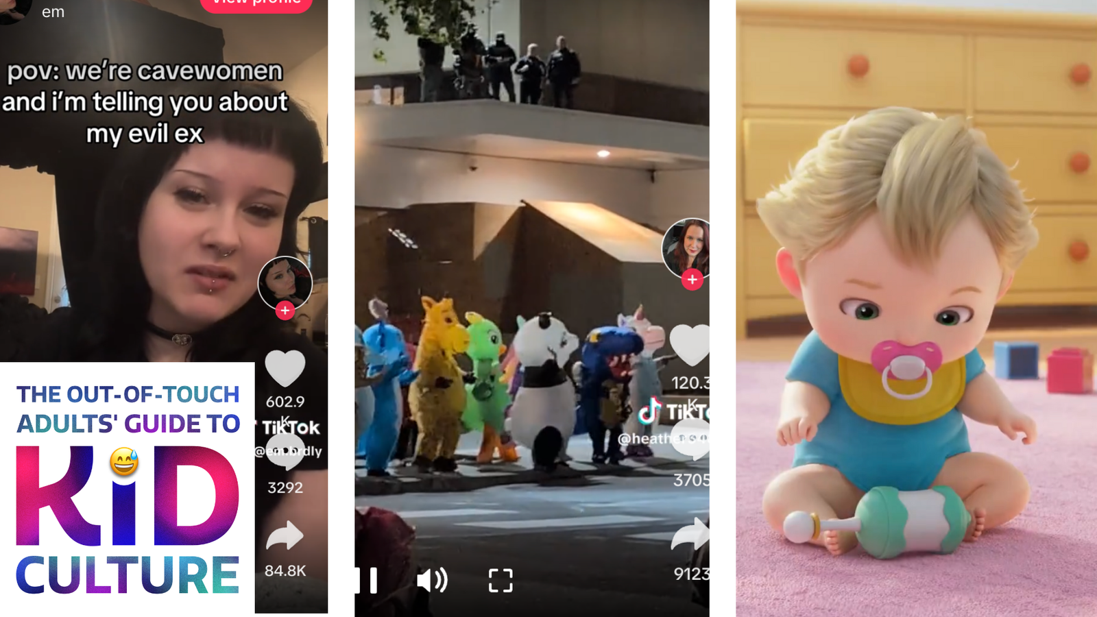 Young people are always finding new ways to blur the lines between irony and sincerity, the public and the private, and every thing else: TikTokers are using a caveman schtick to tell sad romantic stories; a Twitch streamer broadcast the birth of her daughter to her adoring chat; and young people are meeting a deadly serious political moment with colorful animal costumes. There’s also a new cartoon, for some reason, from Nintendo, and the rise of slopcore.