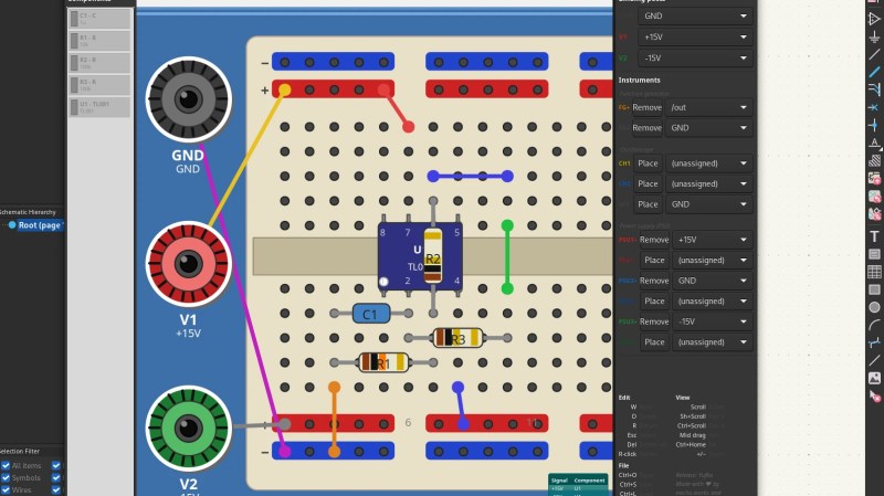 As it stands, the tools are limited to a few select ICs, which, much to this scribe’s disappointment, did not include the venerable 555 timer; however, it would be possible to work around that with some imagination at the schematic level. The ability to drop in and document power supply, function generator, and oscilloscope probing points is nice, enabling one to close the loop on documenting a layout to make it truly transferable to physical reality.