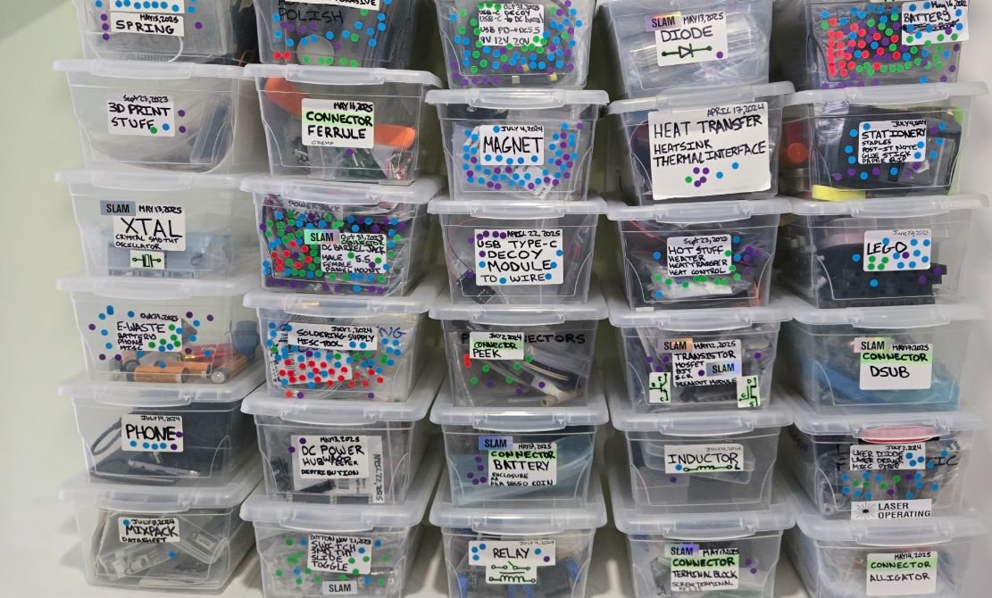 The first change was to only put parts, components, and supplies in transparent boxes. Next was to add a sticker on each box noting the contents and box creation date. This was extended to plastic bags inside the boxes when further subdivision was warranted.