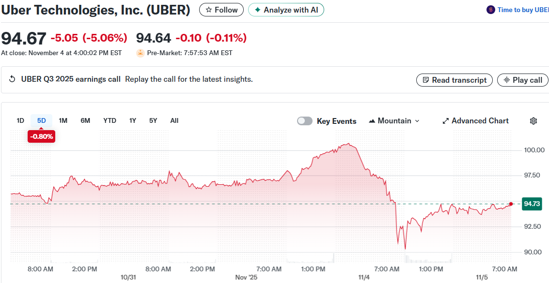 Uber stock fell more than 5% on Tuesday following third quarter earnings that exceeded Wall Street expectations. The drop puzzled some investors given the company’s strong financial performance.