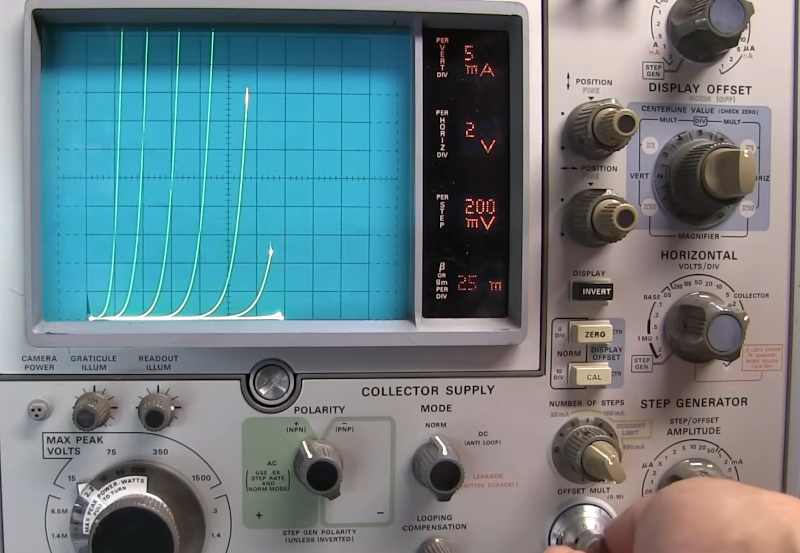The curve tracer in the video is a beautiful instrument of its own. The digital displays give it a high tech yet retro look. A curve tracer, if you haven’t used one, plots stepped voltages against current flowing, and is very useful for examining semiconductor devices. While not as fancy, it is possible to make one to connect to a scope quite easily.