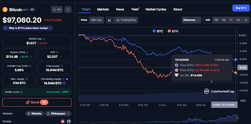 Tracking the ongoing price trend of Bitcoin and Ethereum at the time of press, a comparative chart between the two reveals that Bitcoin is priced at $97,114.55, reflecting a decline of 6.15%. Over the same period, Ethereum’s price dropped to $3,204.89, experiencing a larger 9.43% decrease.