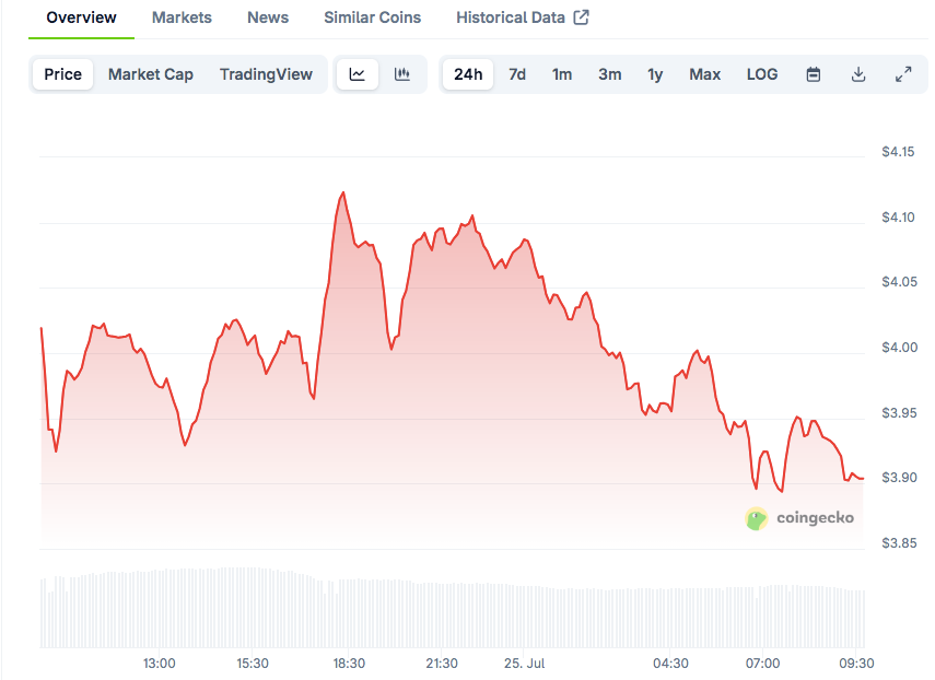 This shift dried up organic demand. And during bearish cycles, those limited drivers couldn’t sustain price. Despite strong tech, DOT slipped out of favor. At publication, DOT trades at just below $4, a level it has stagnated at for a while now.