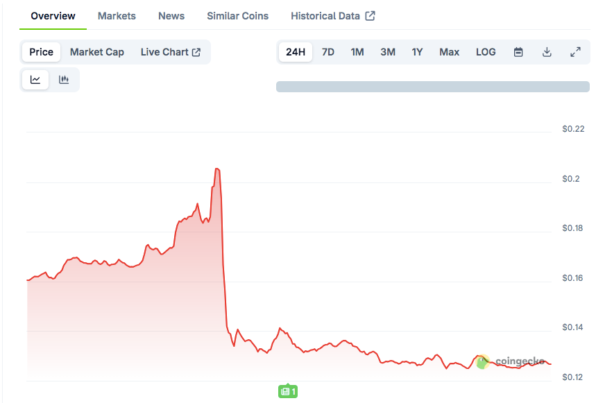 The Solana memecoin POPCAT has seen a steep price decline in recent trading sessions. According to CoinGecko, the token currently trades at $0.1259 with a 24-hour volume of $243.6 million.Â