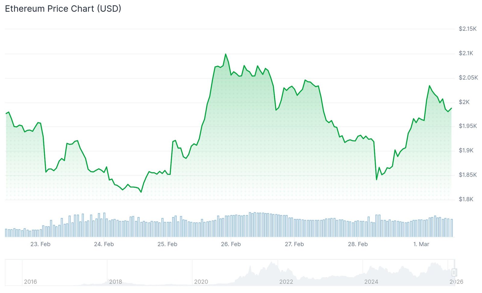 Regarding market dynamics, ETH rallied more than 6.5% within 24 hours following US military operations against Iranian targets, which temporarily destabilized global markets. Bitcoin plunged to $63,000 before stabilizing near $67,000. Ethereum touched $1,841 before recovering toward the $2,000 level.