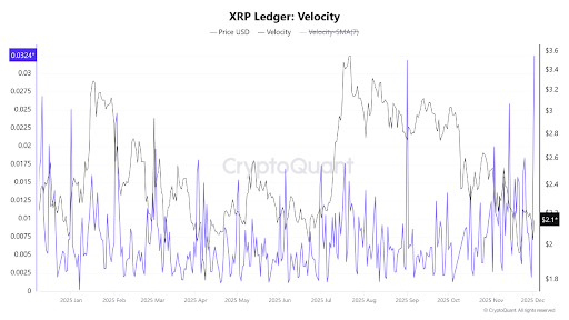 CryptoQuant analyst CryptoOnchain confirmed that XRP velocity reached 0.0324 on December 2, representing a multi-month peak.