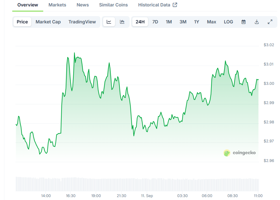 CoinGecko data shows XRP trading at $3.00 with over $4.2 billion in daily volume. That represents a 0.89% gain in the last 24 hours and a 6.59% rise over the past week. Market participants are treating this as a potential start of a more extended rally.