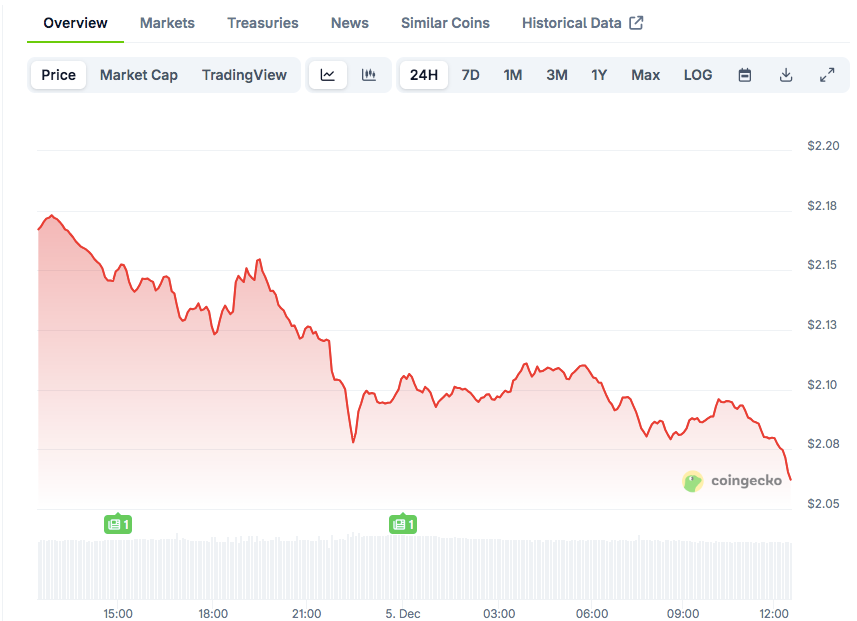 The digital asset now approaches a critical support zone at $2.04 that could determine its next major move. Trading volume remains robust at over $3.1 billion in 24 hours despite the recent price weakness.Â
