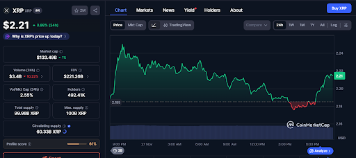 According to CoinMarketCap data at the time of press, XRP price trades at $2.21 after recording a 0.88% gain within the day, as the price chart shows consistent intraday movement marked by repeated rises and pullbacks. A deeper analysis reveals that the XRP price moved through small waves of upward momentum during the day before shifting into a period of softer action that narrows the trading range.