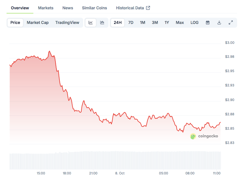 Per CoinGecko, XRP is trading at $2.86, marking a 3.84% decline in the last 24 hours but still up 0.74% over the past week. The coin’s 24-hour trading volume stands above $7 billion, showing steady interest even during correction phases.