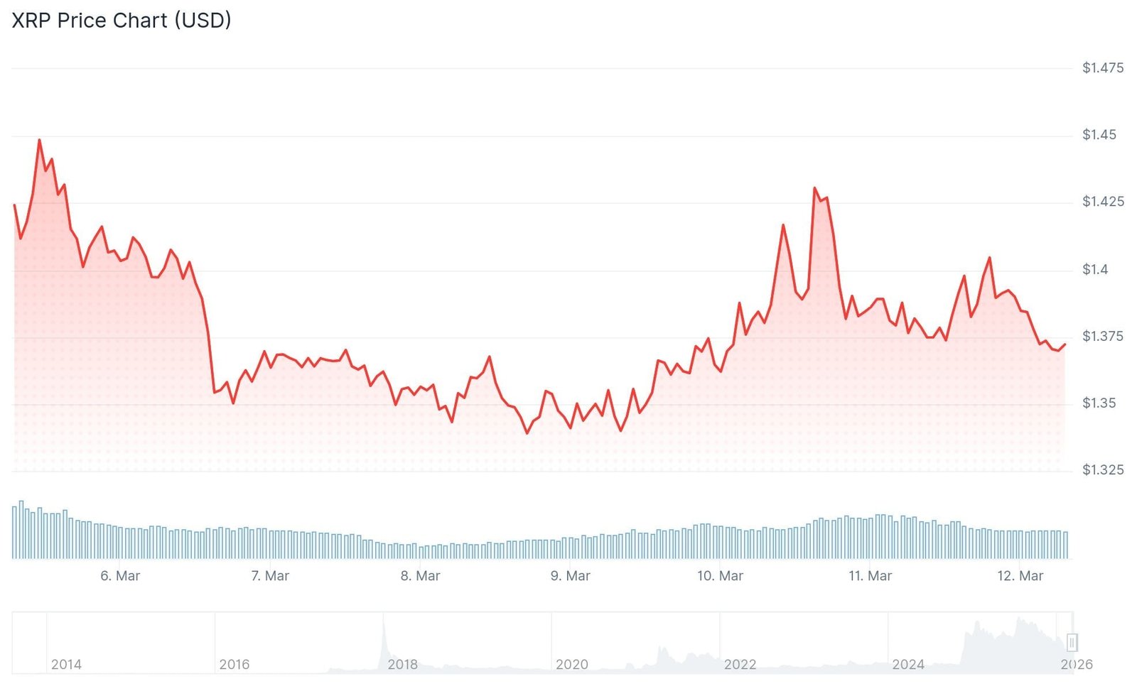As of March 11, 2026, XRP is changing hands at $1.38, maintaining an $84 billion market capitalization. The digital asset has retreated 61% from its July 2025 peak of $3.66.