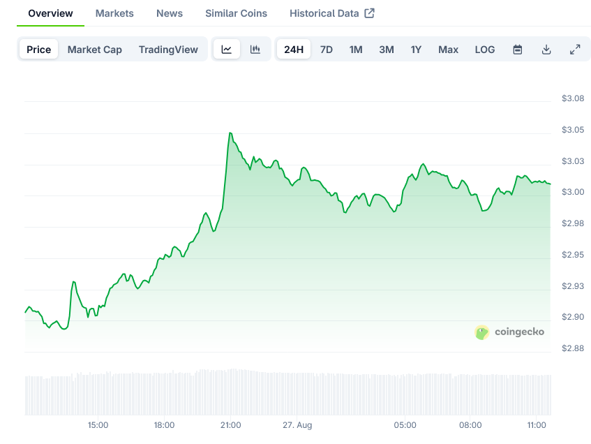 The token has since pushed higher, breaking above the psychologically important $3.00 level. This has renewed trader confidence after recent market turbulence.