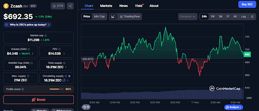 According to a CoinMarketCap report at the time of writing this article, Zcash price exchanges at $692.35 after a 1.5% increase during the last 24 hours. The market cap reached $11.29B as trading conditions show stronger activity across exchanges. Reported volume rises to $4.34B and reflects expanded participation throughout the period. FDV stands at $14.53B as broader valuation remains consistent with recent movements.